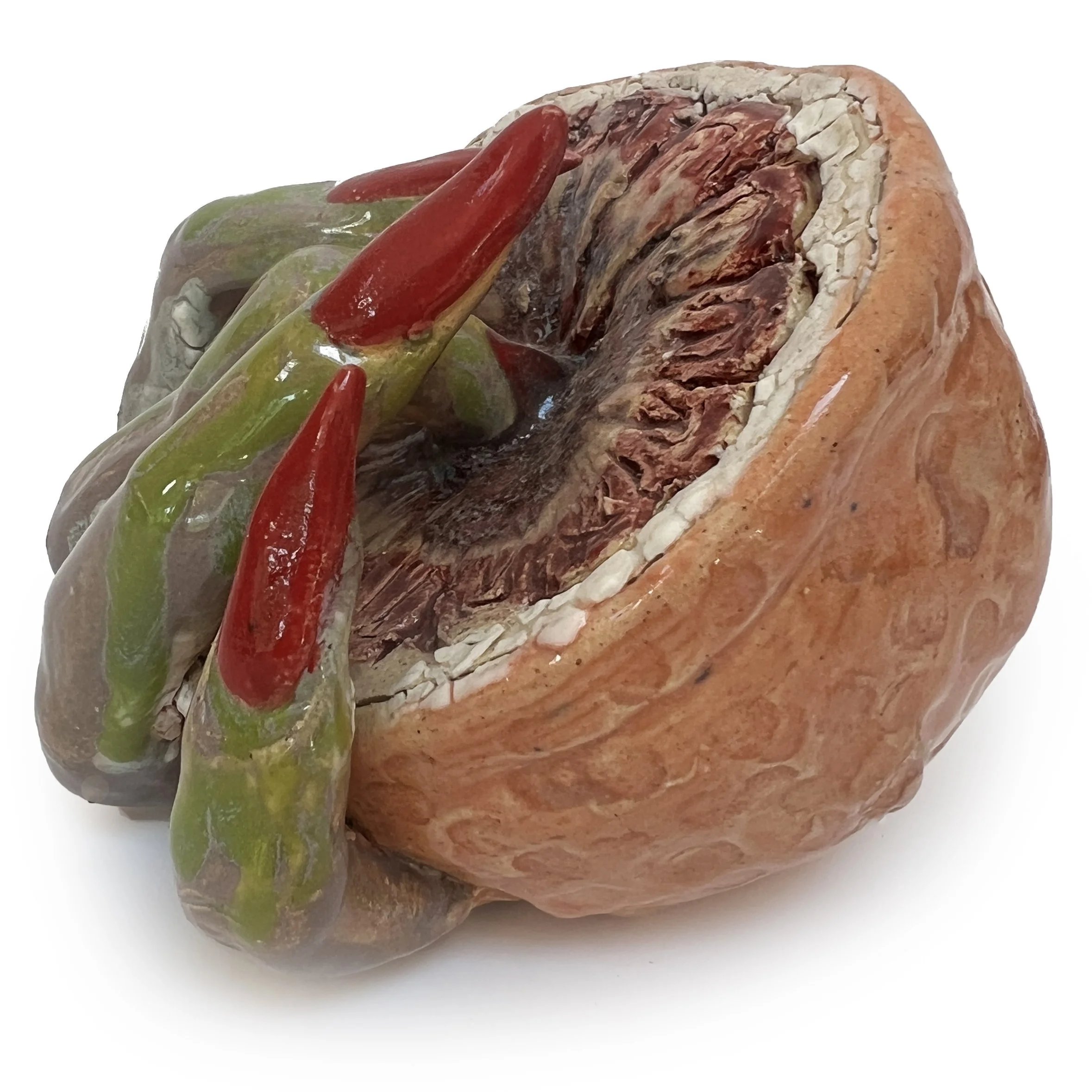 Sweet’s ceramic sculpture Sour Puss explores themes of domestic revolt and the affect of exploitation of feminized labor. Sweet’s video work Tending and accompanying vessels explore the intimacy between rural queers and the land they tend. The video was created in collaboration with Andre Azevedo Sweet. In Sweet’s practice, disability is employed as both constraint and catalyst, shaping material practice while expanding the possibilities of form.